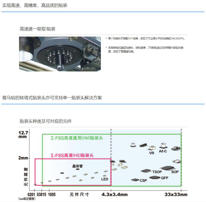 1.轉(zhuǎn)塔式貼裝頭實(shí)現(xiàn)1臺(tái)貼裝頭支持貼裝多種元件,全面實(shí)現(xiàn)快速、通用、高運(yùn)轉(zhuǎn)率。