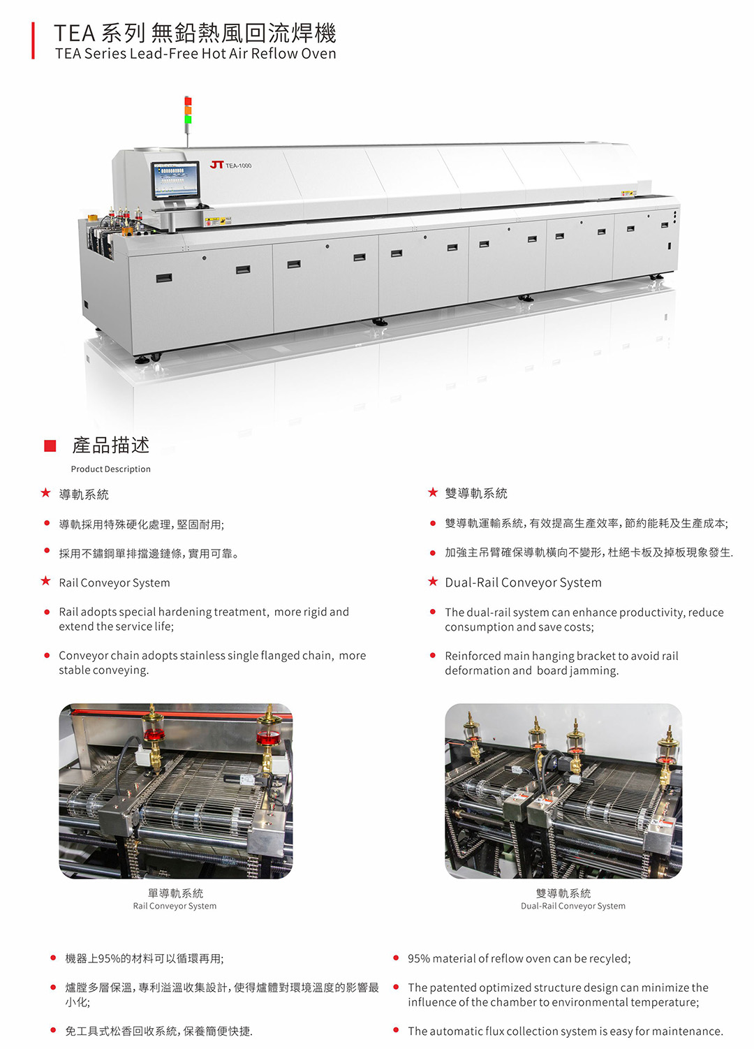 完全滿足各種無鉛焊接工藝要求。Windows7 操作系統(tǒng),中英文界面,操作簡單易學(xué)。標(biāo)準(zhǔn)上8下8空氣爐,專利熱風(fēng)管理系統(tǒng)使熱風(fēng)對流傳導(dǎo)更高效熱捕捉更快。PLC十PID閉環(huán)控制,性能穩(wěn)定可靠,溫度控制及曲線重復(fù)精度高。雙溫度傳感器,雙安全控制模式,速度異常報警,掉板報警。全模塊化設(shè)計(jì),維護(hù)保養(yǎng)方便快捷,減少維護(hù)時間及成本…